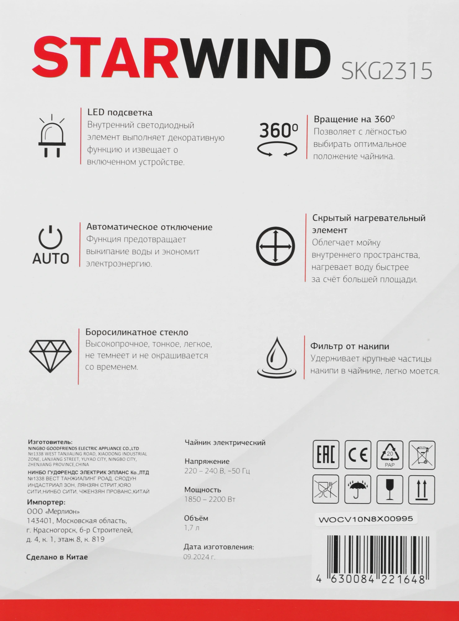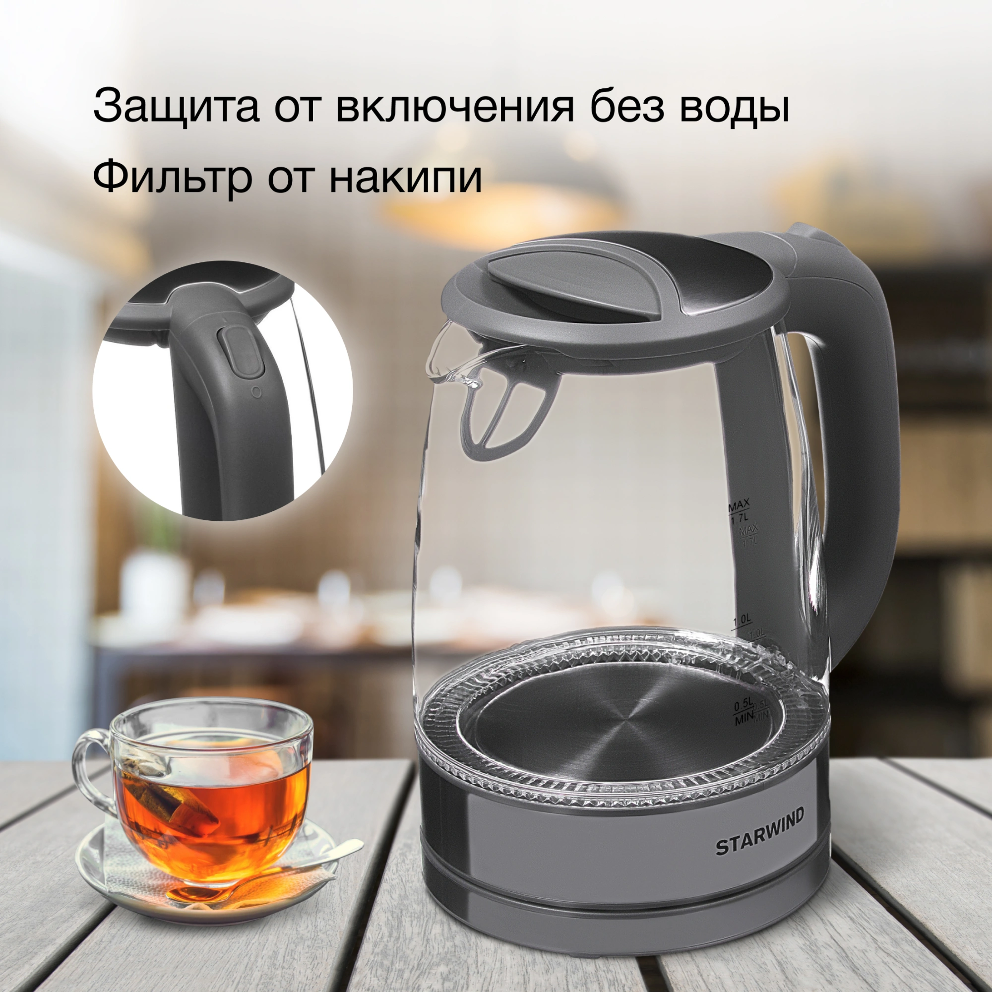 Чайник электрический STARWIND SKG2315 станет незаменимым помощником на вашей кухне. Стильный дизайн, выполненный в сером цвете, и стеклянный прозрачный корпус устройства, отлично впишутся в современный дизайн, как жилой квартиры, так и офисного помещения. Изюминкой данной модели является подсветка, которая включается во время нагревания.