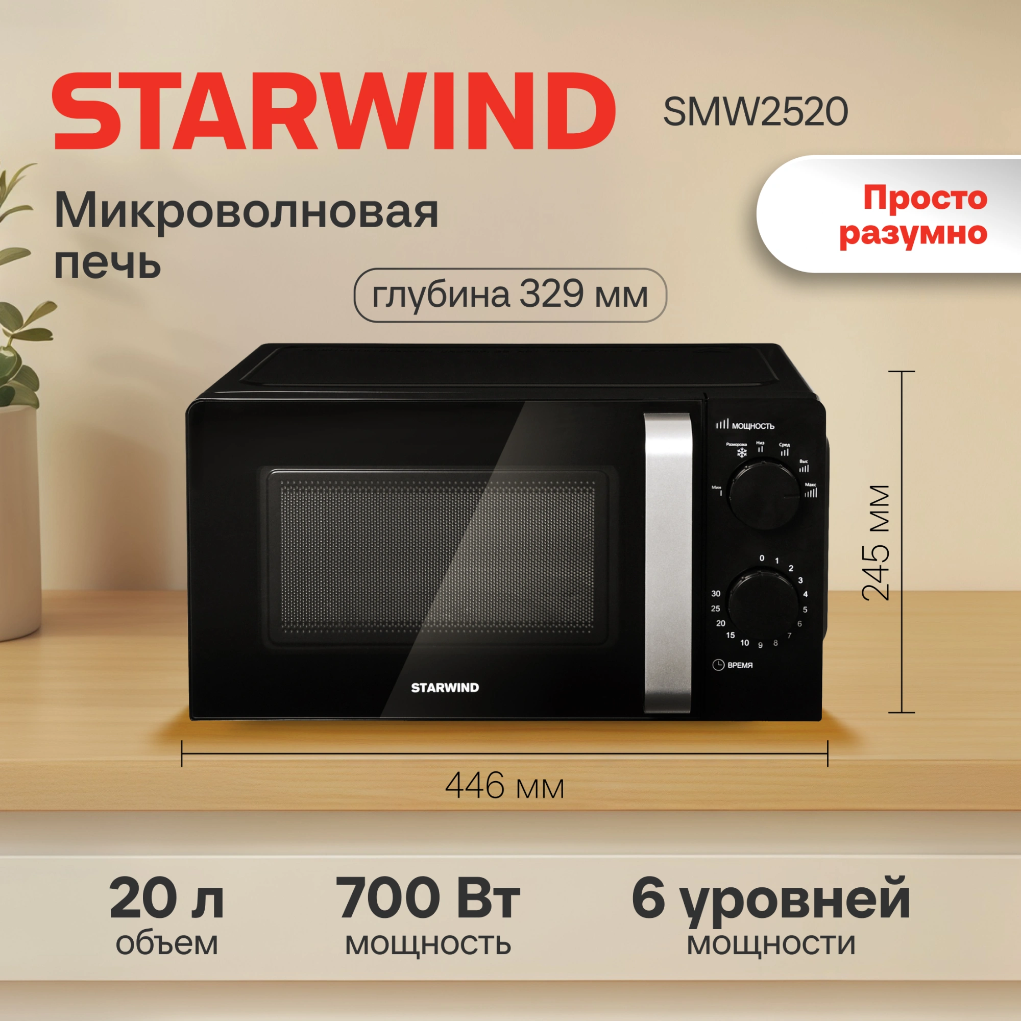 Микроволновая печь STARWIND SMW2520 – это универсальный помощник, который не только позволит вам справиться с ежедневными задачами разогрева пищи, но позволит с разы быстрее приготовить стандартные блюда, среди которых: творожная запеканка, яблочное пюре, овощи, буженина и многое другое, главное, правильно настроить мощность и выбрать время приготовления. Дверца печи выполнена из жаропрочного стекла, предотвращающего нагревание внешних поверхностей. В центре дверцы находится специальное окошко, позволяющее наблюдать за процессом приготовления. Чтобы открыть дверь необходимо просто потянуть за ручку, расположенную на самой двери.