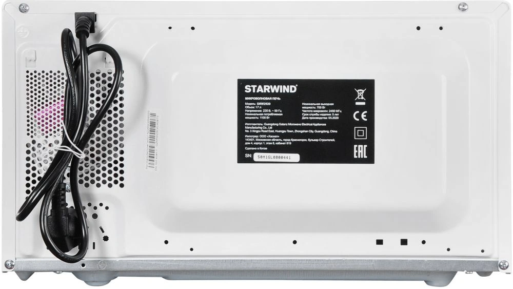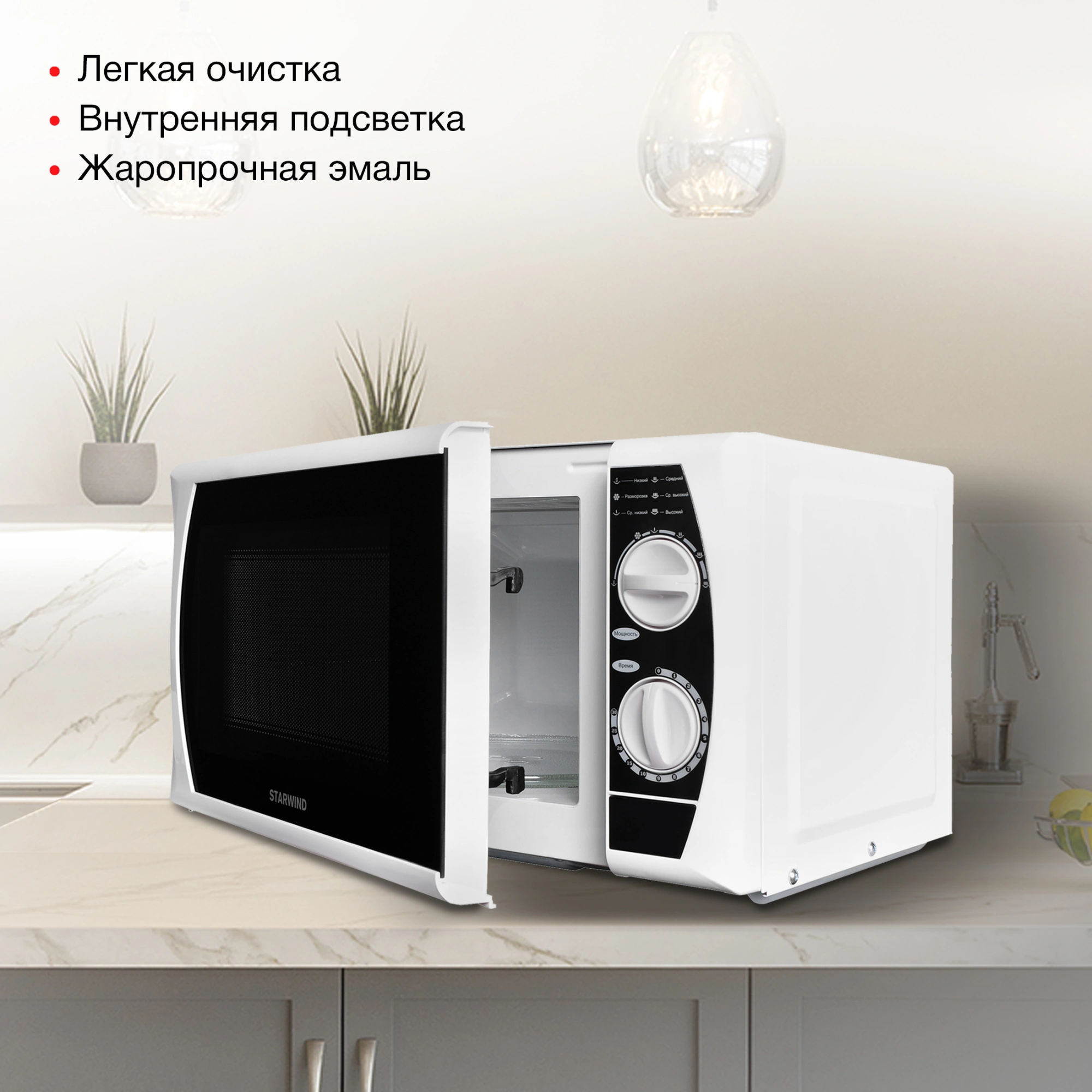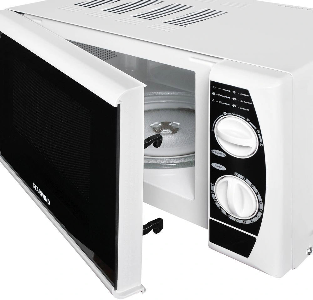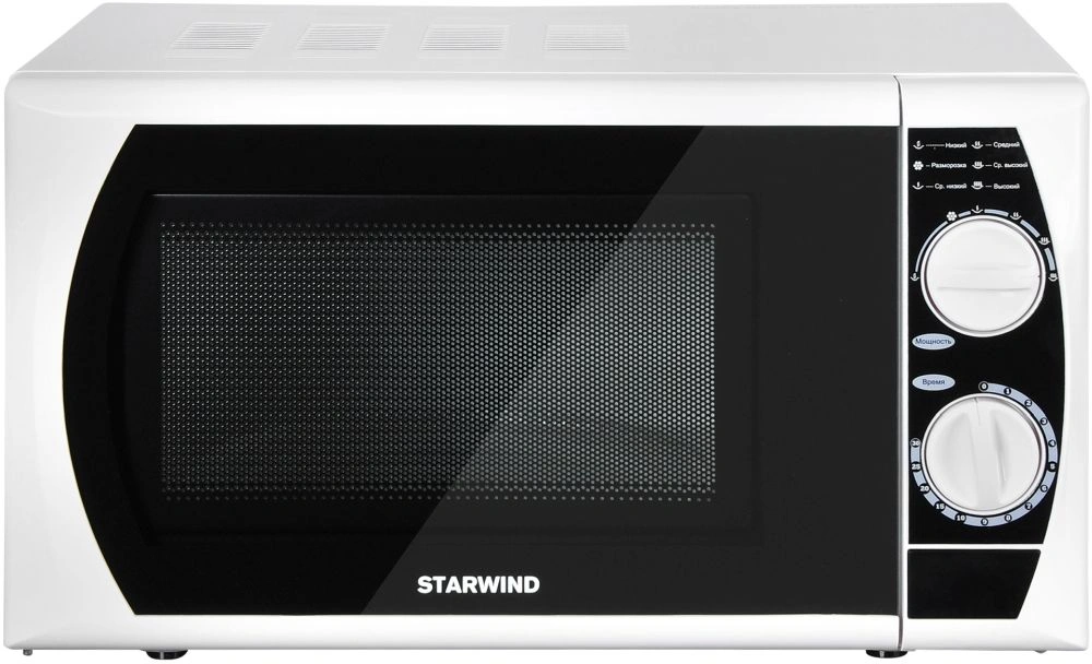 Стильный дизайн, продуманная конструкция и компактные объемы микроволновой печи STARWIND SMW2920 позволят идеально вписаться в интерьер любой кухни, а особенно – малогабаритной. Корпус печи выполнен из металла в черно-белом цвете. В нижней части предусмотрены прорезиненные ножки, благодаря которым прибор надежно фиксируется на поверхности и не ездит по ней. На дверце установлено смотровое окно из жаропрочного стекла. Справа от двери вверху находится ручка регулировки мощности. В зависимости от типа разогреваемого или готовящегося продукта можно выбрать: «максимальную», «высокую», «среднюю» или «низкую» мощность. А для бережного размораживания фруктов, ягод, овощей или мяса, предусмотрен специальный режим «разморозки», используя который вы сэкономите уйму времени и полезных витаминов и микроэлементов в продуктах.