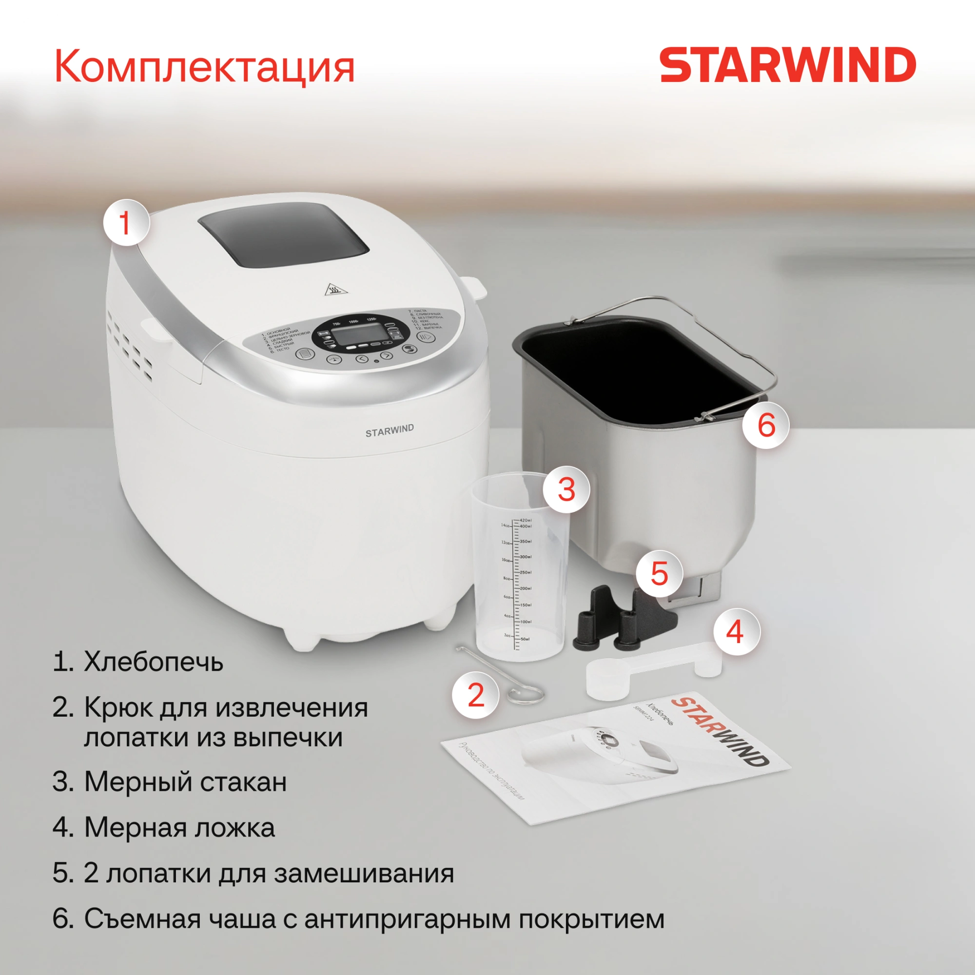 Изготовлена хлебопечь из белого пластика, элегантный дизайн позволит гармонично вписаться в интерьер любой кухни.