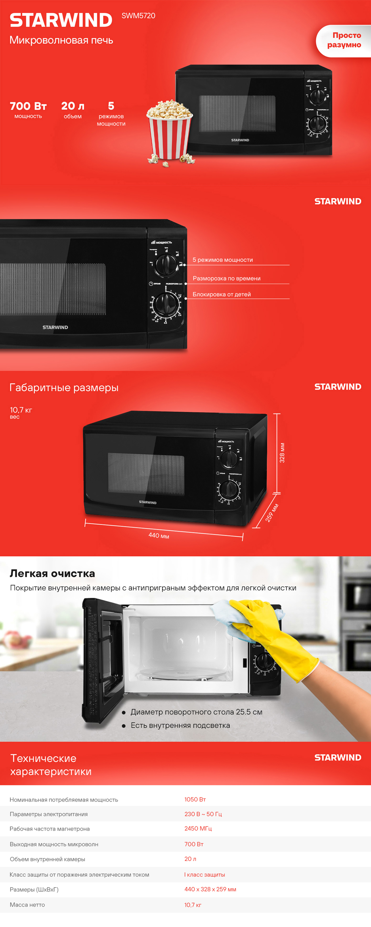 Микроволновая печь STARWIND SWM5720 – простая и доступная во всех отношениях модель с минимальным набором функций. Будет полезна в офисе, на даче и дома. Работает на размораживание, разогрев и приготовление простейших блюд: горячих бутербродов, сэндвичей.