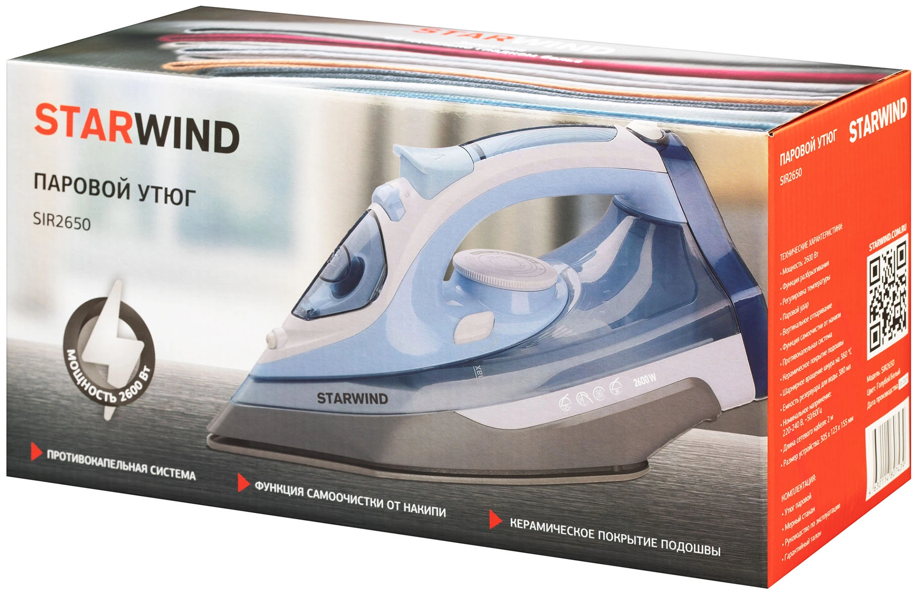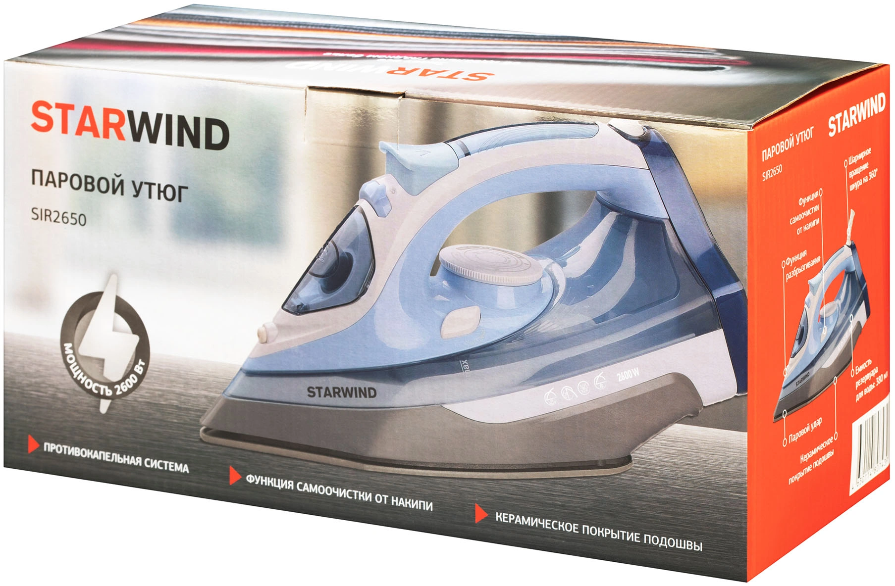 Утюг StarWind SIR2650 – подходящий вариант для ухода за одеждой. Этот мощный прибор не оставит равнодушной ни одну хозяйку. В функционале устройства предусмотрены все необходимые опции. При желании можно воспользоваться вертикальным отпариванием или функцией пароувлажнения. Утюг позволяет справиться с изрядно помятыми вещами в короткие сроки. Для удобства пользователя в комплекте предлагается мерный стаканчик. Достаточно наполнить специальный резервуар водой и выбрать необходимый температурный режим, чтобы начать глажку. Керамическая подошва позволяет прибору беспрепятственно скользить по ткани, а длинный сетевой шнур обеспечивает удобство применения техники.