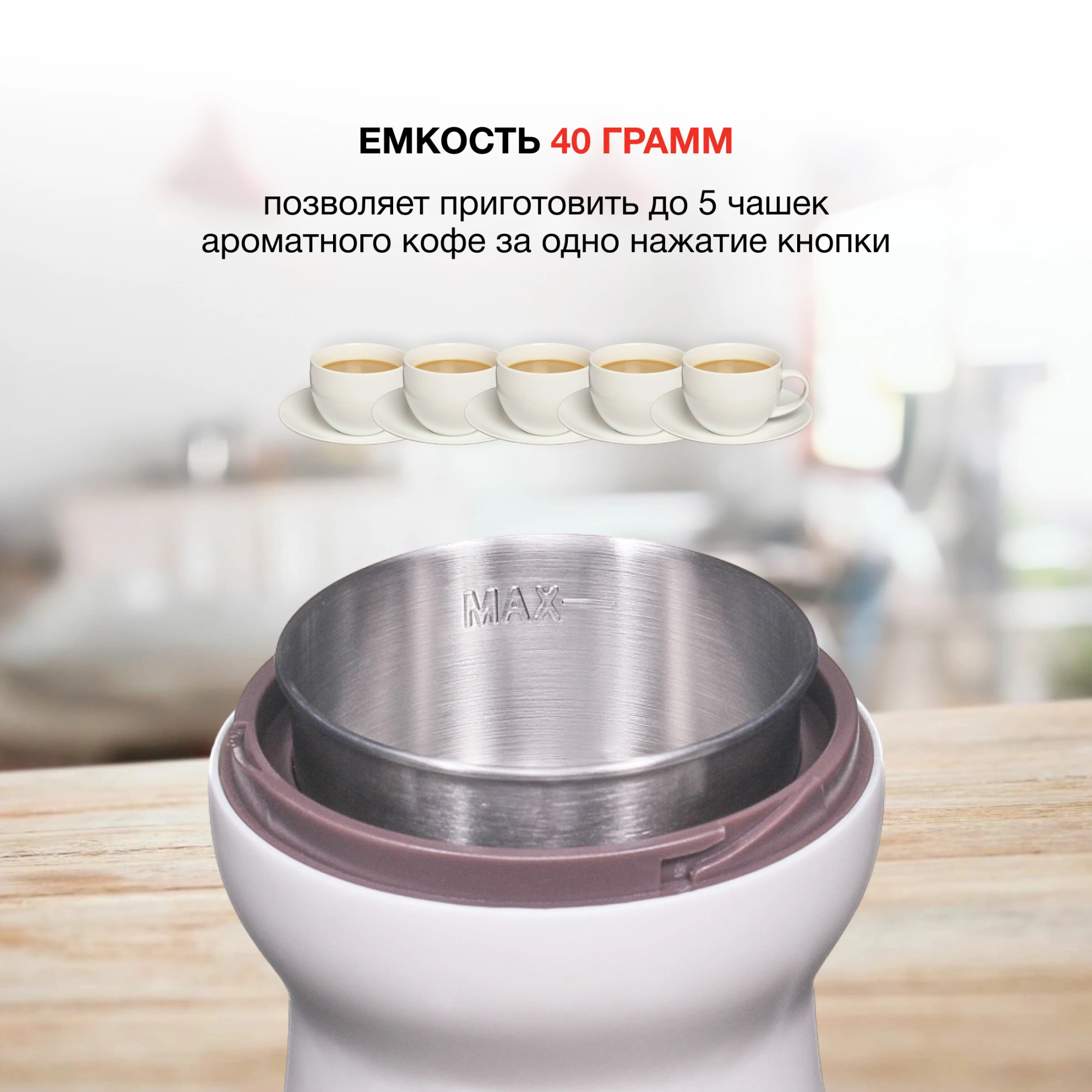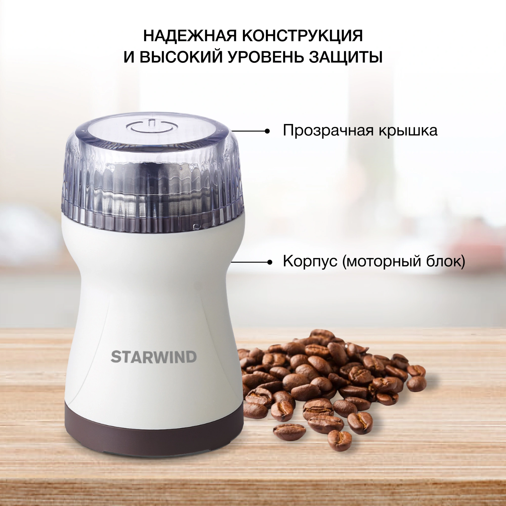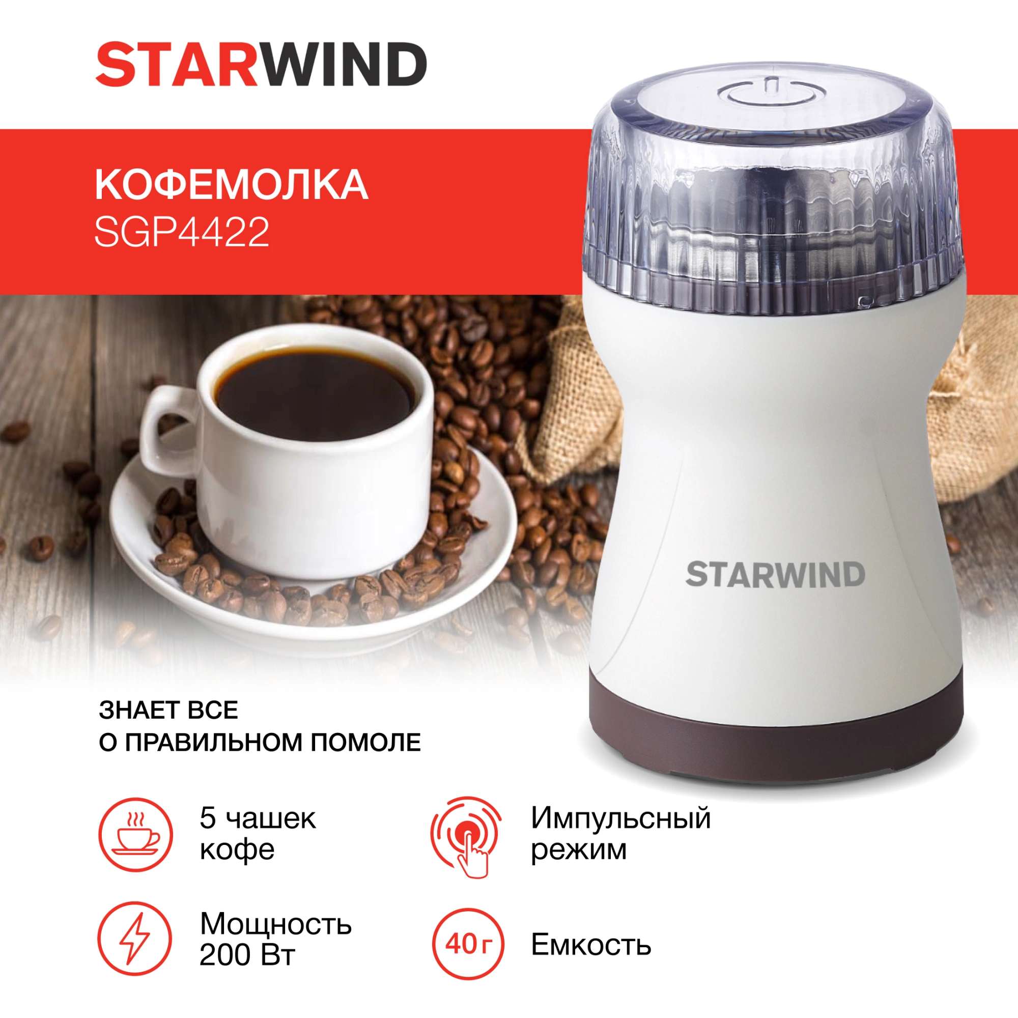 Нет ничего лучше аромата горячего кофе или эспрессо из самых свежих кофейных зерен. Измельчите кофейные зерна с помощью кофемолки Starwind SGP4422. Данная модель предлагает автономную работу без использования ручной работы и размалывает достаточно зерна для 4-5 чашек кофе. Простое управление вкл/выкл. Встроенная защитная блокировка предотвращает работу, если крышка не надежно закрыта. Чаша вмещает до 40 граммов бобов, чего достаточно для ароматного кофе всей семье. Мощный мотор в 200 Ватт и ножи из нержавеющей стали, обеспечивает быстрое и качественное перемалывание любых зерен. Универсальная кофемолка станет незаменимым помощником на кухне. Благодаря конструкции из нержавеющей стали и качественного пластика, Starwind SGP4422 идеально подходит для чего угодно – от обработки специй и трав до кофе и зерновых.